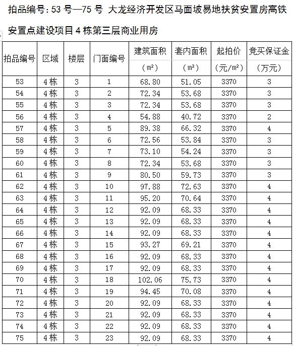 3、大龍經(jīng)濟(jì)開發(fā)區(qū)馬面坡易地扶貧安置房高鐵安置點(diǎn)建設(shè)項(xiàng)目4棟第三層商業(yè)用房23間,建筑面積為54.88㎡-102.06㎡,起拍價(jià):3370元/㎡,競(jìng)買保證金2—4萬(wàn)元/間;