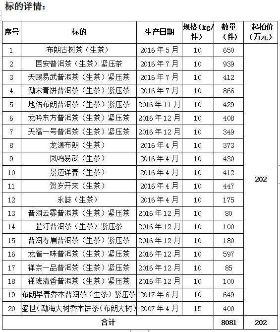 布朗古樹(shù)茶(生茶)、國(guó)安普洱茶(生茶)緊壓茶、天賜易武普洱茶(生茶)緊壓茶、龍吟東方普洱茶(生茶)緊壓茶、龍?jiān)床祭剩ㄉ瑁┑?/span>20個(gè)品種共計(jì)8081件,產(chǎn)地:云南,規(guī)格:10kg/件-15kg/件,每件餅數(shù):28-42。