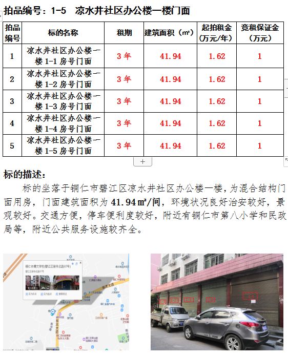 1、涼水井社區(qū)辦公樓一樓門面5間1-1、1-2、 1-3、 1-4、 1-5)3年租賃權(quán)(建筑面積:41.94㎡/間);起拍租金單價(jià)(每間):1.62萬元/年;競租保證金(每間):1萬元;