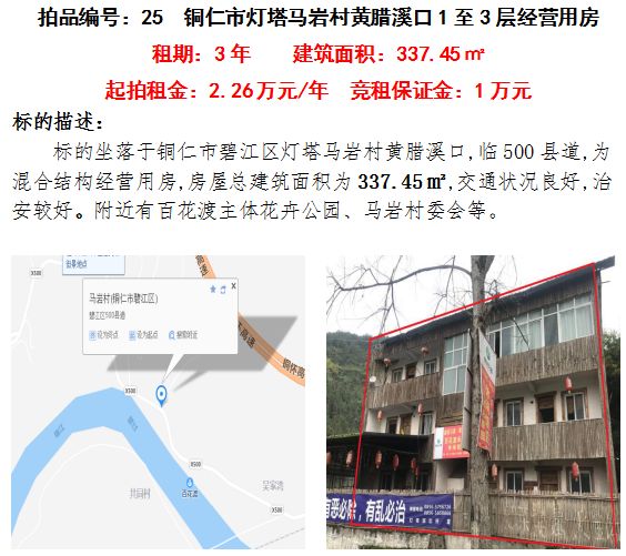 6、銅仁市碧江區(qū)燈塔馬巖村黃臘溪口1-3層經(jīng)營房3年租賃權(quán)(建筑面積:337.45㎡);起拍租金單價(jià):2.26萬元/年;競租保證金:1萬元;