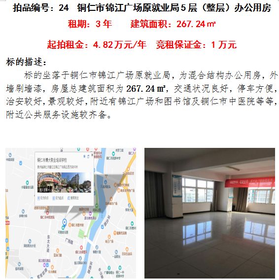 5、銅仁市錦江廣場原就業(yè)局第五樓辦公用房3年租賃權(quán)(建筑面積:267.24㎡);起拍租金單價(jià):4.82萬元/年;競租保證金:1萬元;
