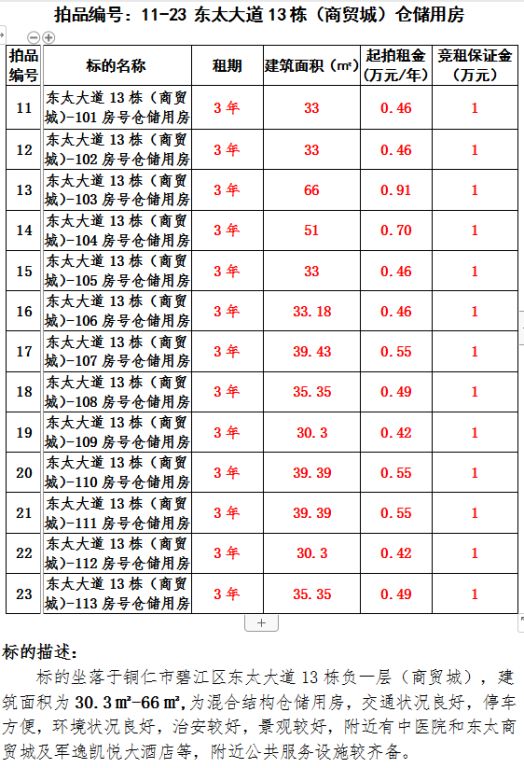 4、東太大道13棟(商貿(mào)城)倉儲(chǔ)(13間)3年租賃權(quán)(建筑面積30.3㎡-66㎡/間);起拍租金單價(jià)(每間):0.42萬元/年-0.91萬元/年;競租保證金(每間):1萬元;