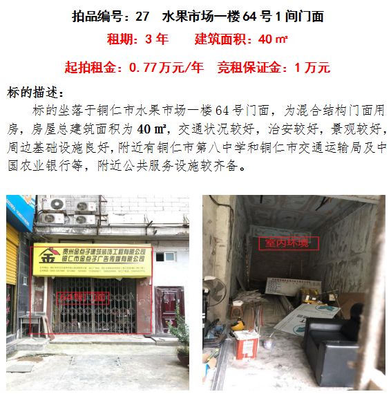 8、銅仁市水果市場一樓64號(hào)門面3年租賃權(quán)(建筑面積:40㎡);起拍租金單價(jià):0.77萬元/年;競租保證金:1萬元;