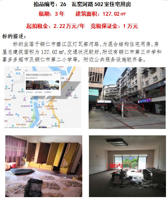 7、銅仁市碧江區(qū)瓦窯河路502室住宅用房3年租賃權(quán)(建筑面積:127.02㎡);起拍租金單價(jià):2.22萬元/年;競租保證金:1萬元;