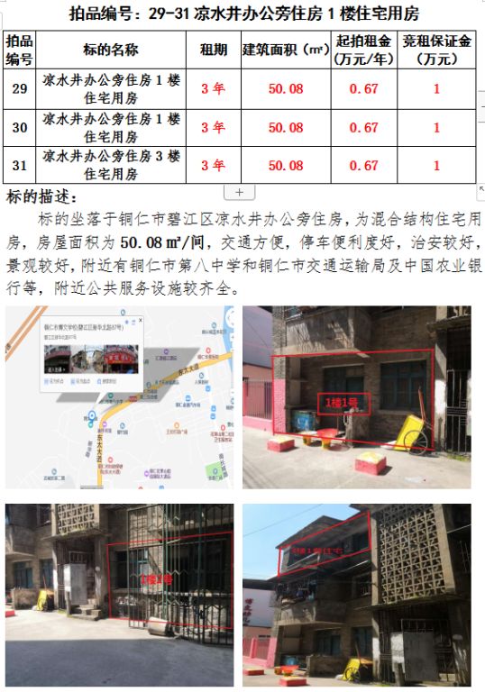 11、銅仁市碧江區(qū)涼水井辦公旁住宅用房三間3年租賃權(quán)(建筑面積:50.08㎡/間);起拍租金單價(jià)(間):0.67萬元/年;競租保證金:1萬元;