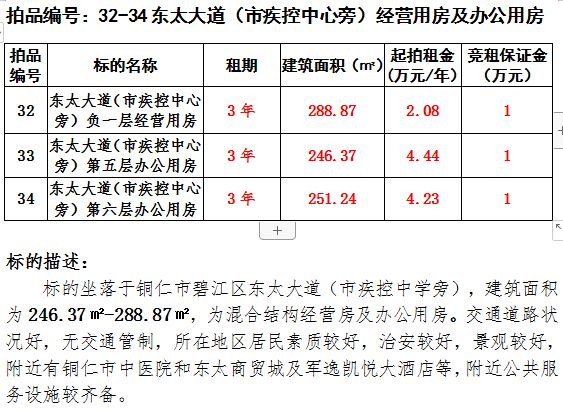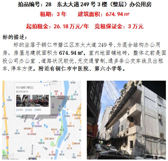 10、銅仁市碧江區(qū)東太大道249號(hào)辦公室3年租賃權(quán)(建筑面積:674.94㎡);起拍租金單價(jià):26.18萬元/年;競租保證金:3萬元;